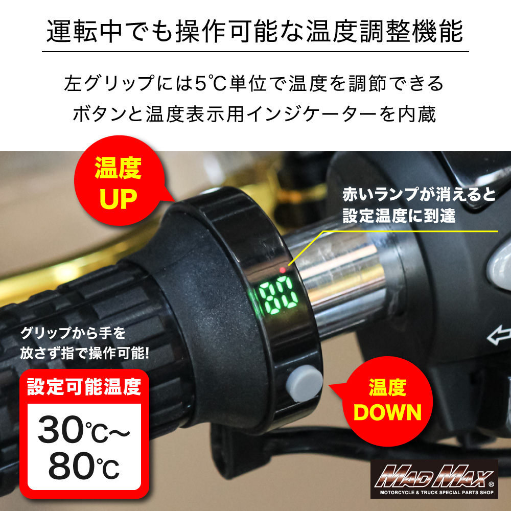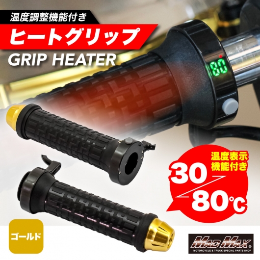 22.2Φハンドル専用 ホットグリップ 非貫通 防寒 温度調整機能付き 12V ブラック/ゴールド。