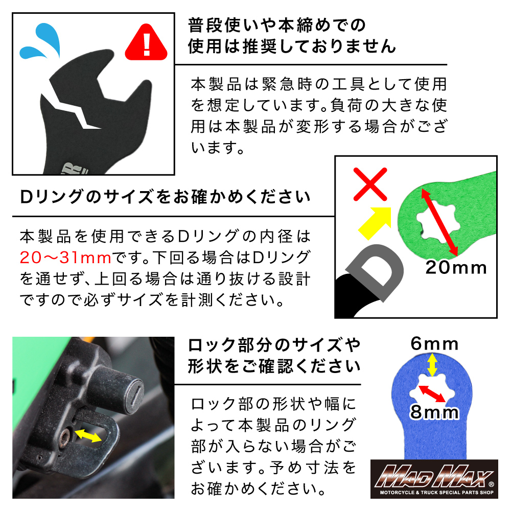 ※注意※商品は緊急用の簡易スパナ、メガネレンチなので増し締めなど本締め用工具としては使用しないで下さい。商品が曲がったり折れる可能性があります。商品を工具として使用した場合、商品の色が剥がれる場合がありますが、商品異常では御座いません。
