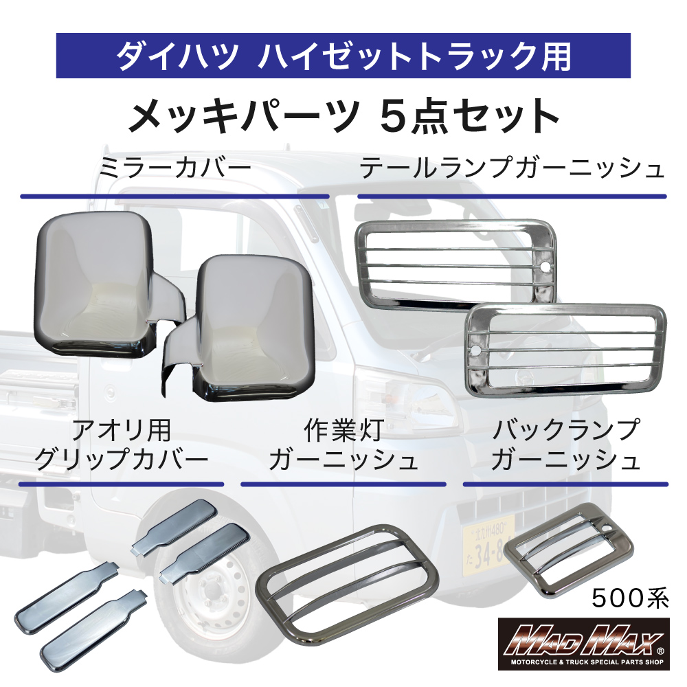 ダイハツ ハイゼットトラック 500系 用 メッキ ミラーカバー バックランプ テールランプ 作業灯 ガーニッシュ ステンレス アオリ ハンドルグリップカバー 5点セット