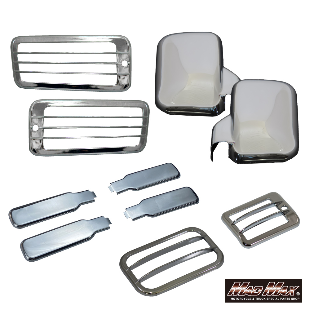 ミラーカバー、バックランプガーニッシュ、テールランプガーニッシュ、作業灯ガーニッシュはABS樹脂メッキ仕上げ、